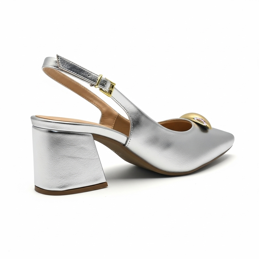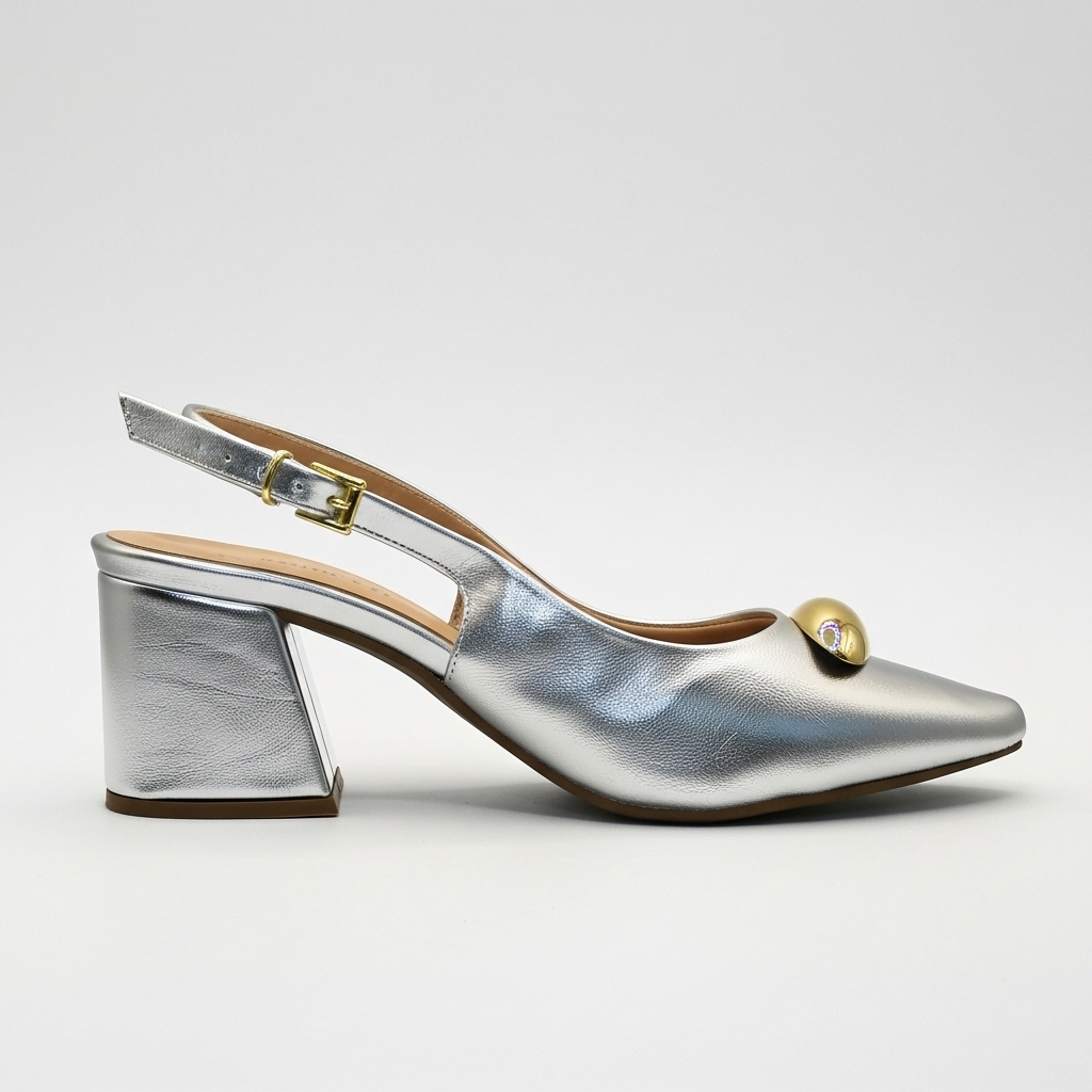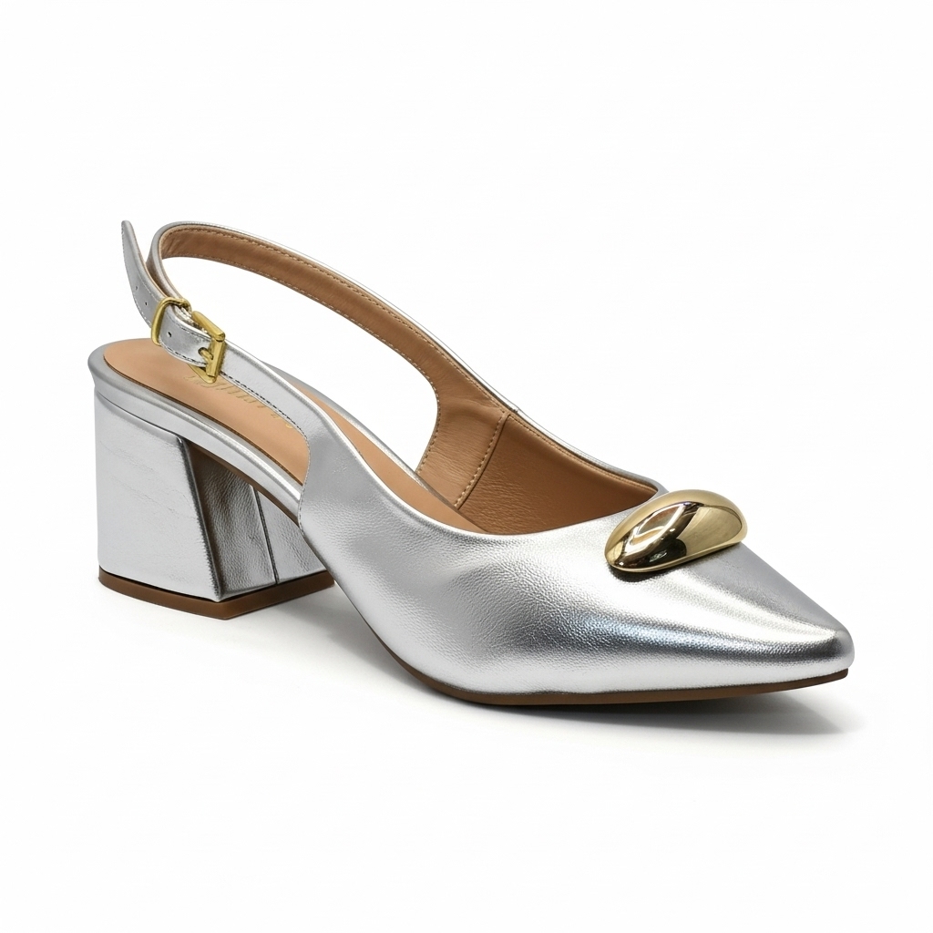 Sapato Slingback Feminino Gabriela Salto Bloco Prata Metalizado com Enfeite Dourado Orgânico