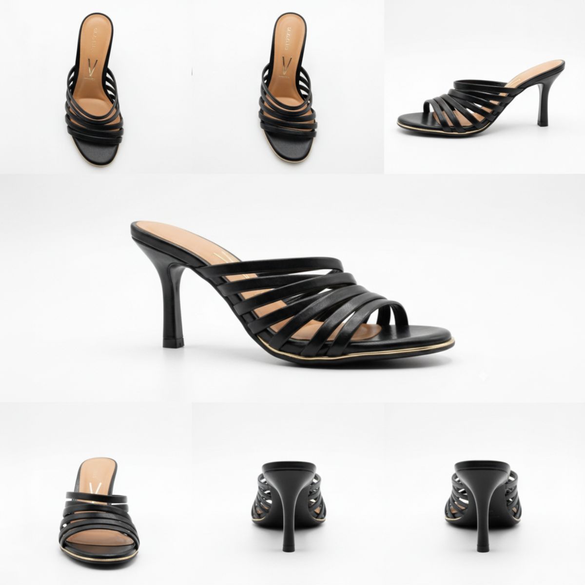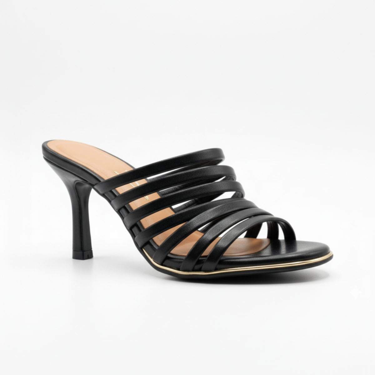 Elegância e modernidade em um só passo. Este tamanco preto apresenta um design sofisticado com múltiplas tiras finas e um salto fino escultural, finalizado com um sutil e luxuoso filete dourado na base.