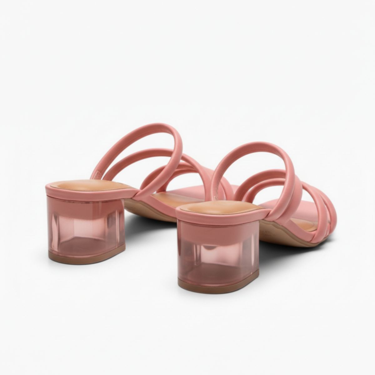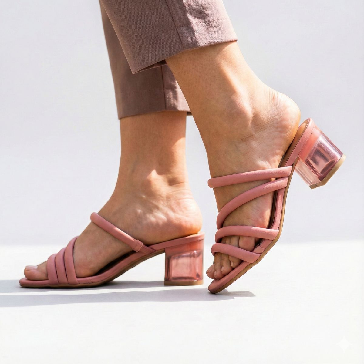 Salto Acrílico (Trend Alert): O grande diferencial deste modelo é o salto bloco feito em acrílico translúcido (efeito cristal) na mesma tonalidade rosa do calçado. Ele traz leveza visual e um toque futurista/moderno ao look.