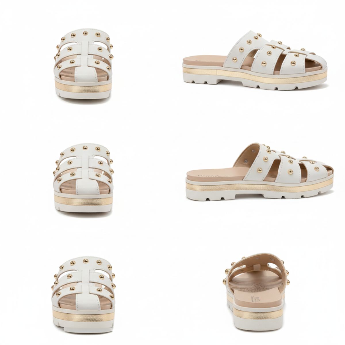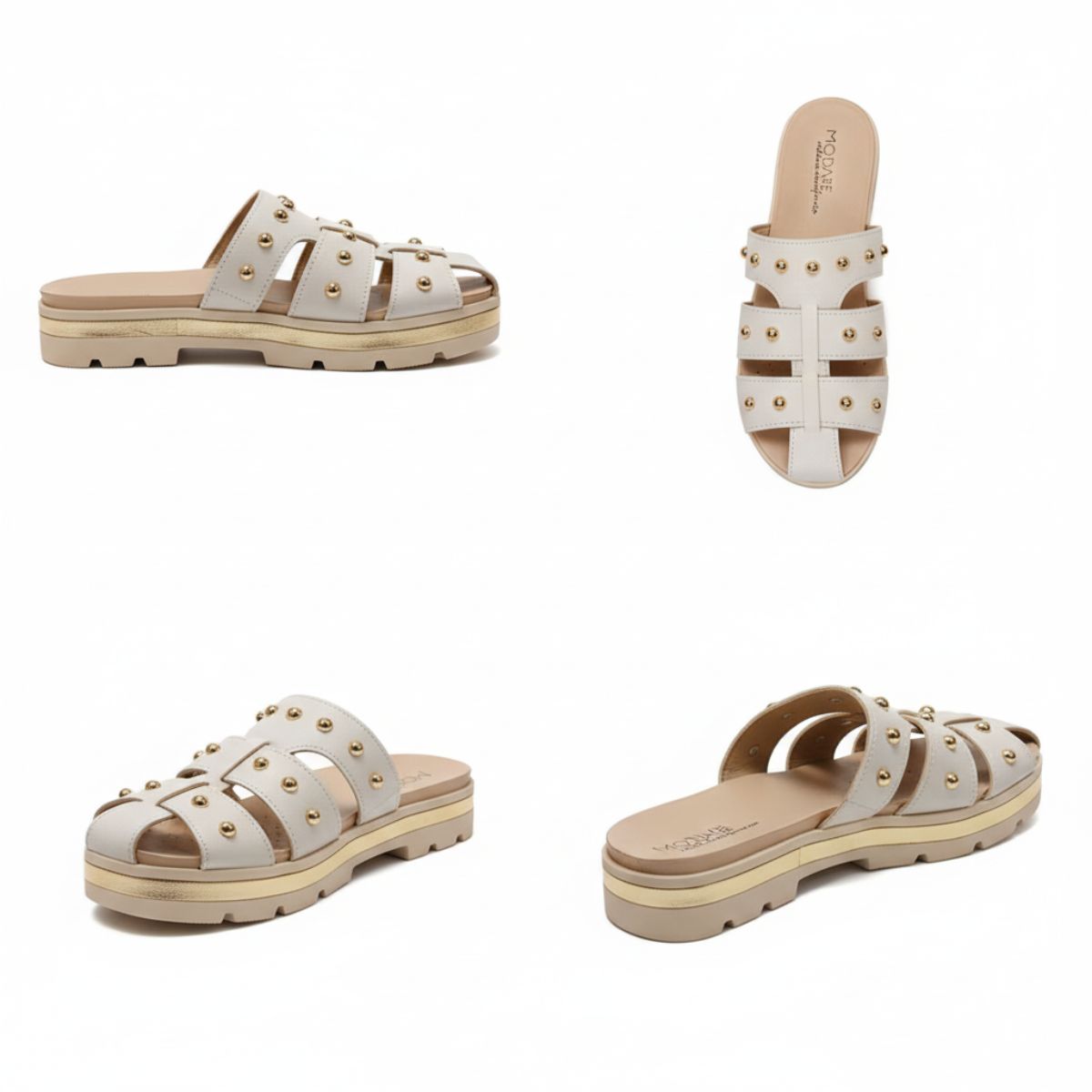 Com um design moderno em tom off-white (creme), este modelo se destaca pelas suas tiras largas adornadas com tachas esféricas douradas, trazendo um toque de glamour e modernidade ao visual. O solado flatform, levemente tratorado, possui um elegante filete metalizado dourado na lateral, criando uma harmonia visual luxuosa.