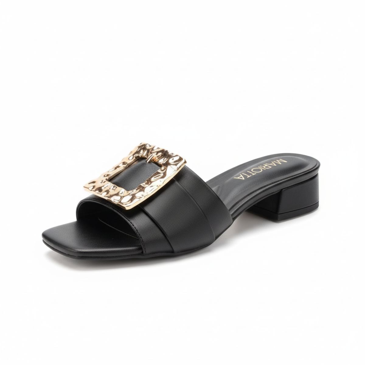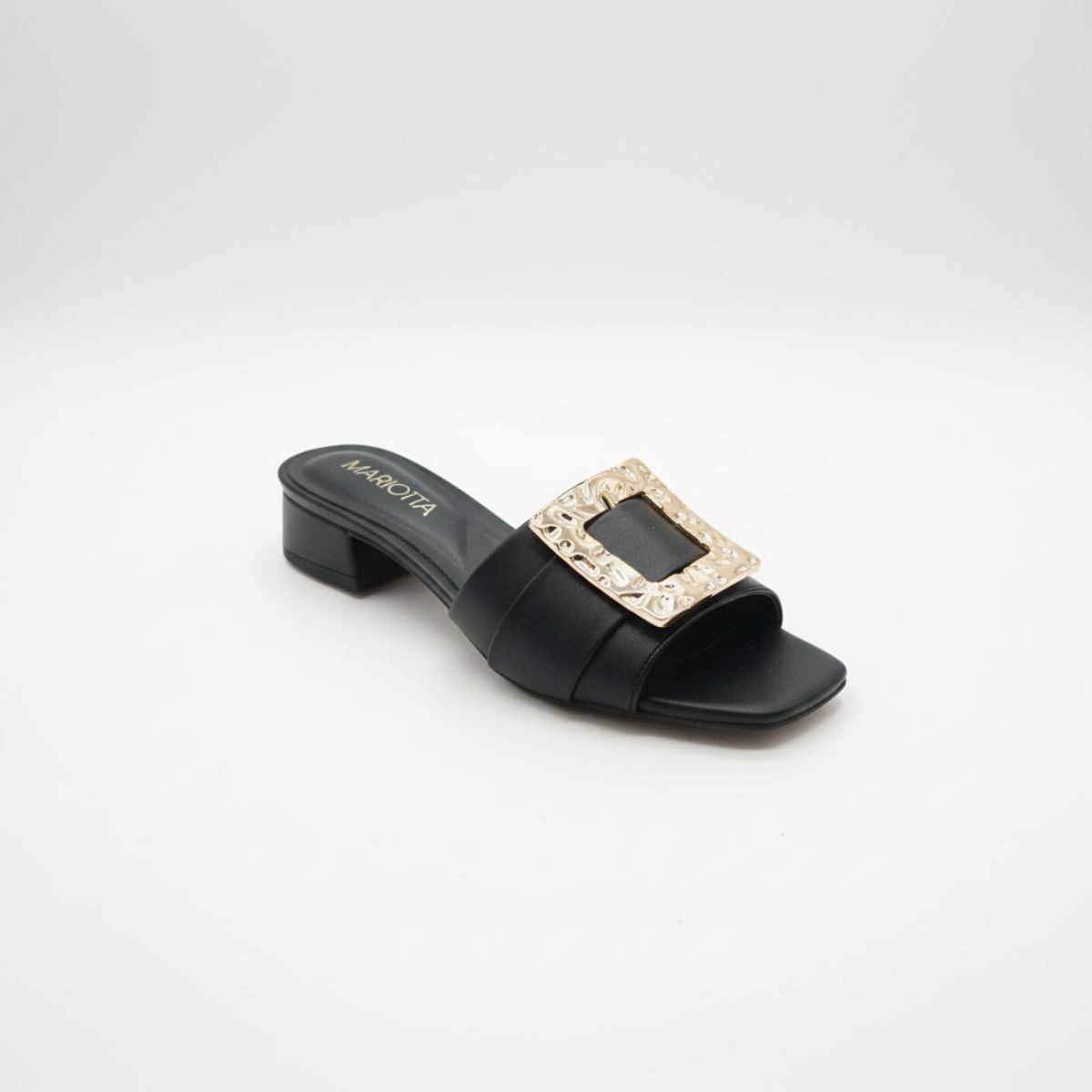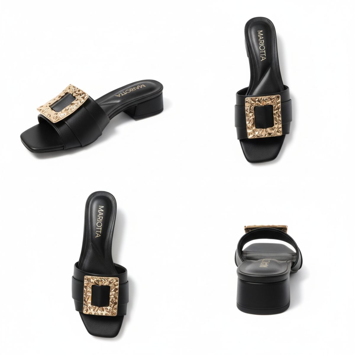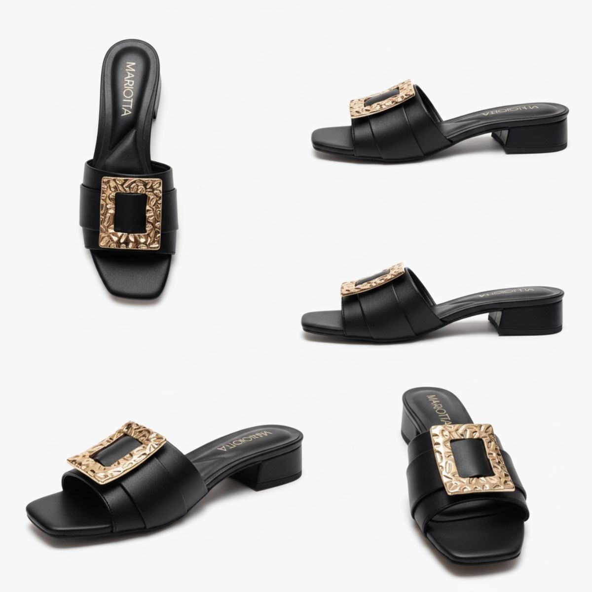 Tamanco Slide Preto Salto Baixo com Maxifivela Dourada Texturizada