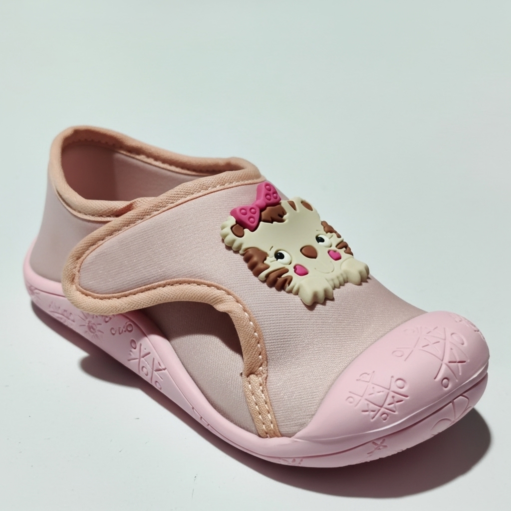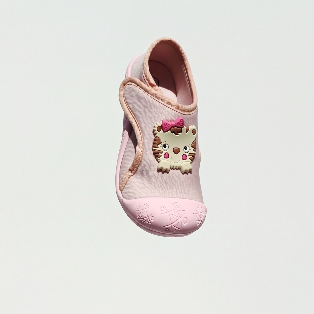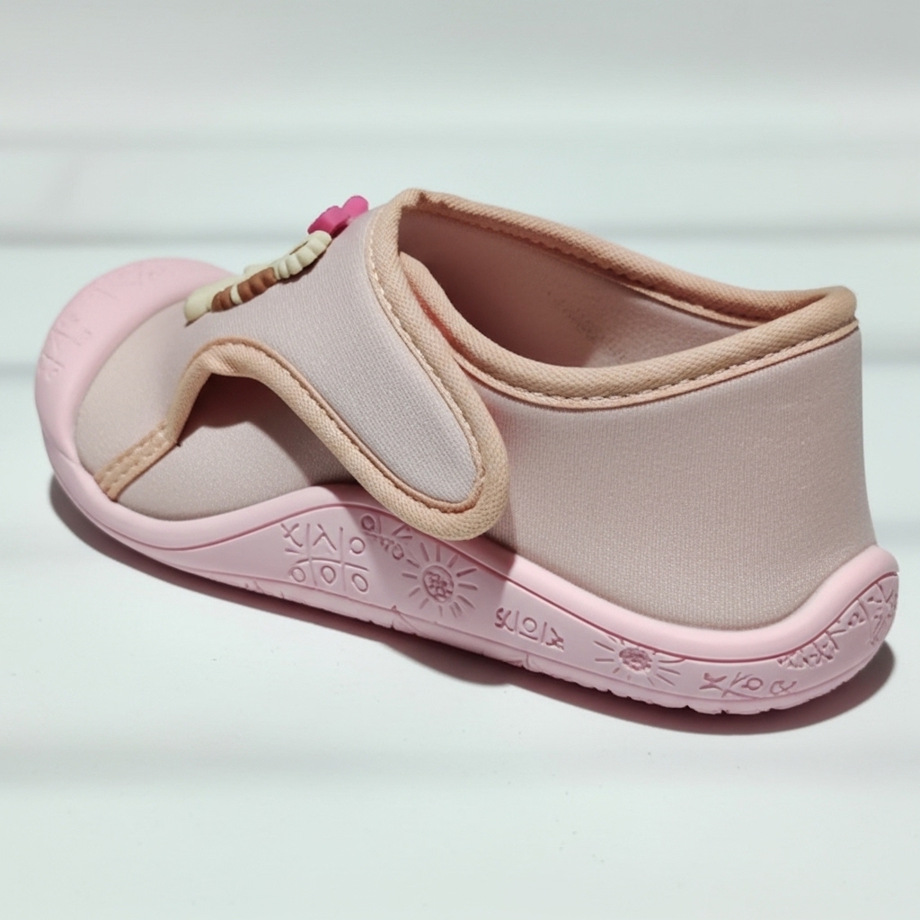 Solado e Proteção: O solado é do tipo “caixa”, injetado em borracha (ou PVC) flexível, leve e antiderrapante, totalmente na cor rosa. O grande diferencial é a biqueira de borracha robusta que se estende sobre a ponta dos dedos, oferecendo máxima proteção contra impactos e tropeços, ideal para a fase dos primeiros passos.