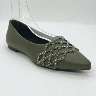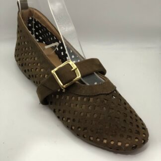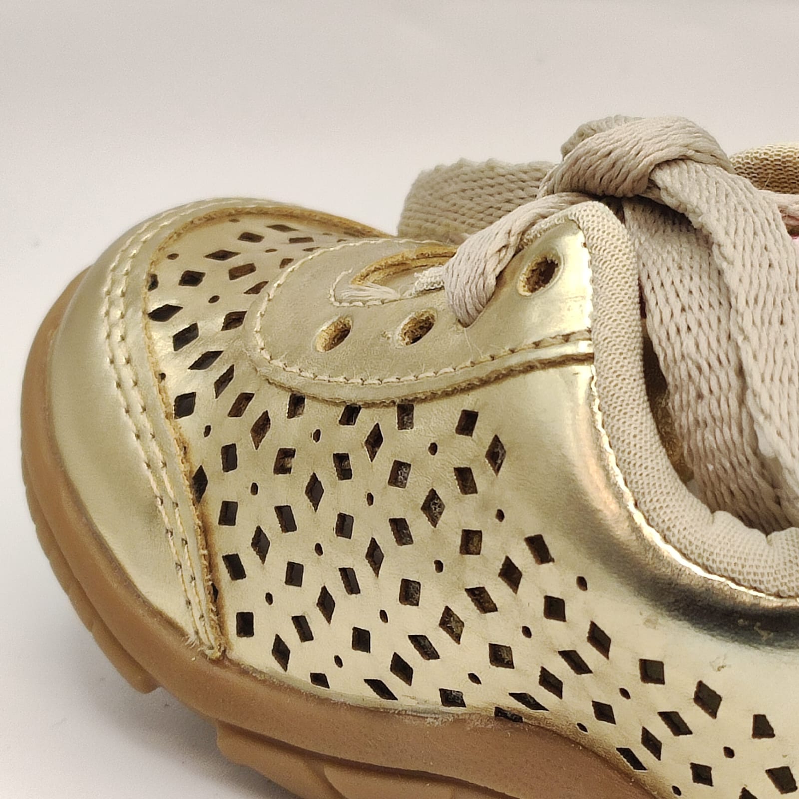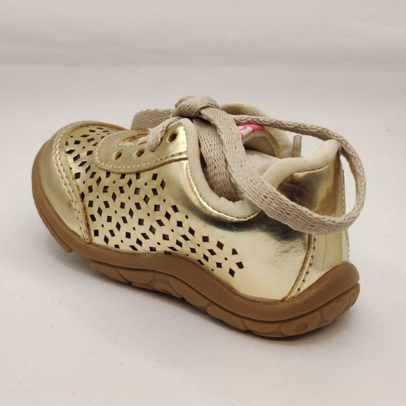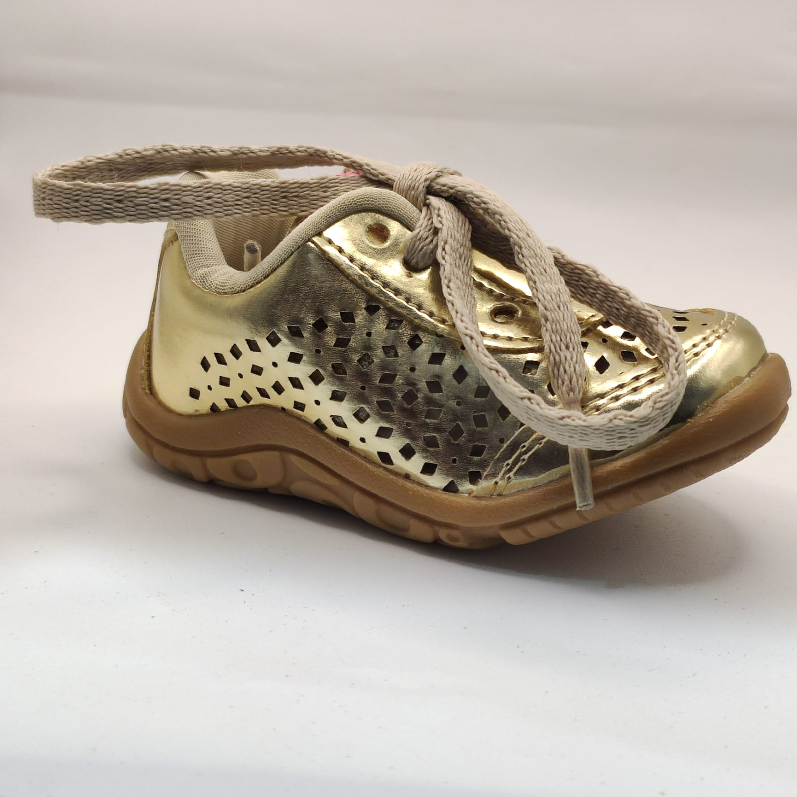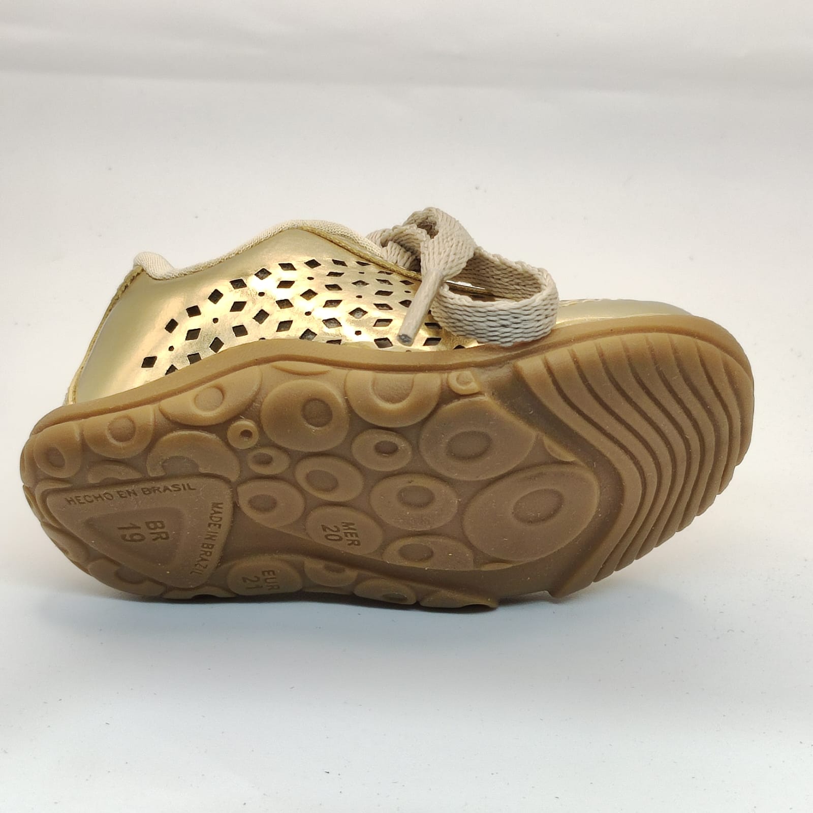 Confeccionado em material sintético de alta durabilidade com um sofisticado acabamento metalizado na cor dourada, o calçado se destaca visualmente. O cabedal (parte superior) apresenta um design distintivo de recortes geométricos vazados, em padrões de losangos e quadrados, que se estendem das laterais até a biqueira. Esta característica de design não é apenas estética, mas também funcional, pois promove uma ventilação superior, mantendo os pés arejados e confortáveis durante o uso prolongado.