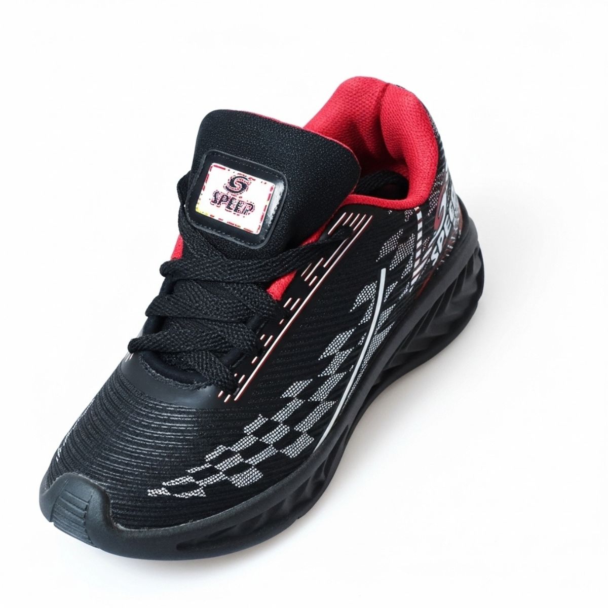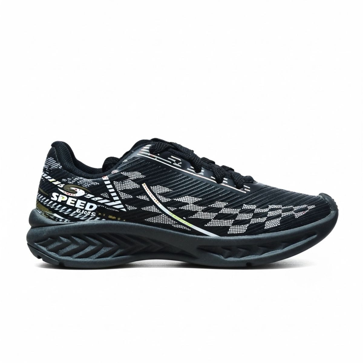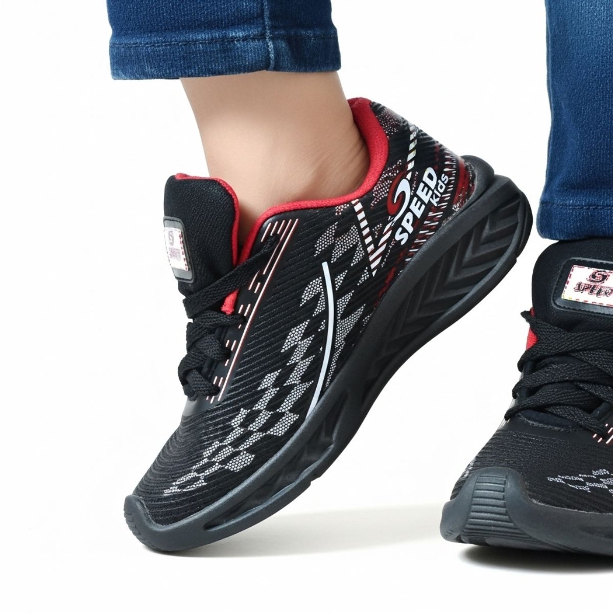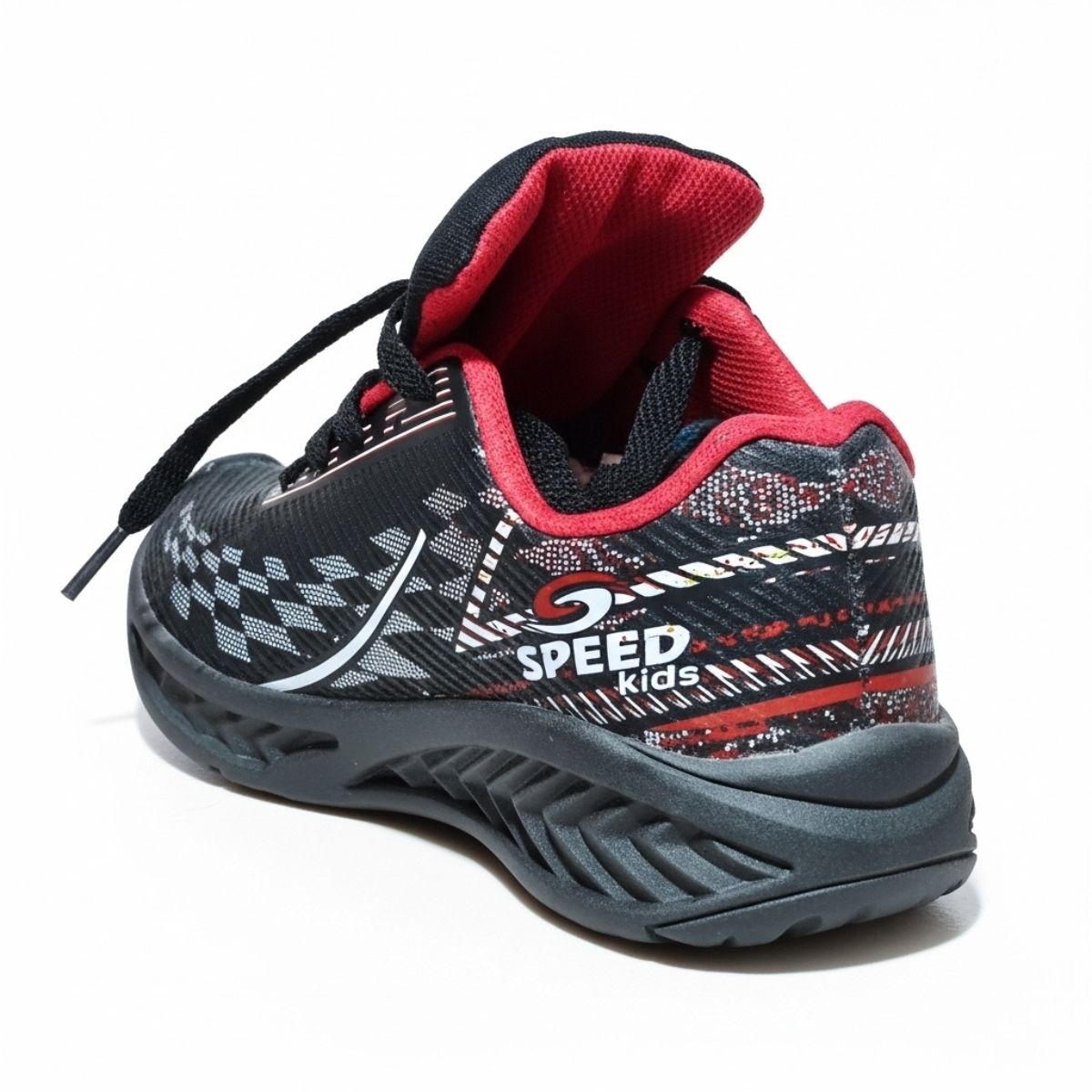Design e Estampa: O cabedal possui uma estampa gráfica dinâmica inspirada no universo da “velocidade” (speed), com padrões quadriculados (remetendo a bandeiras de corrida) e as inscrições “Speed Kids” e “Speed” em branco e vermelho na lateral e no calcanhar.