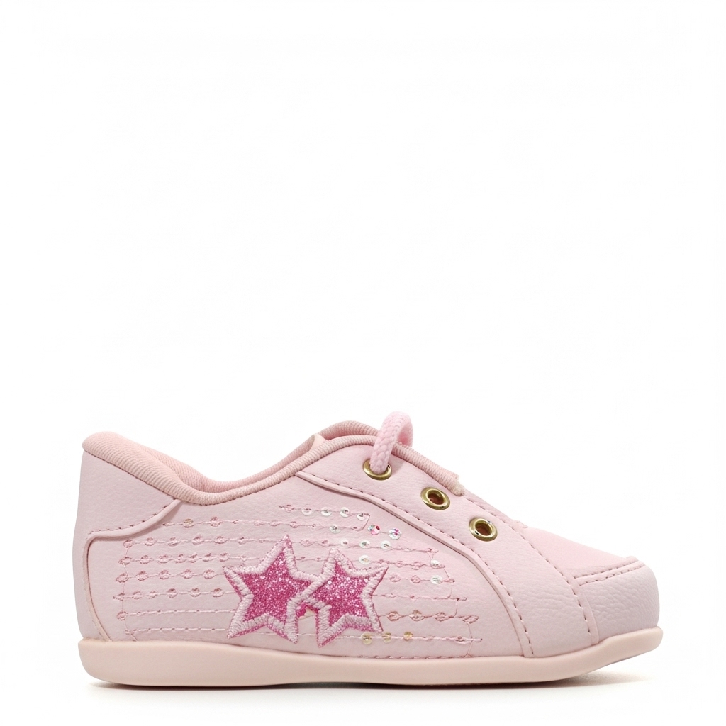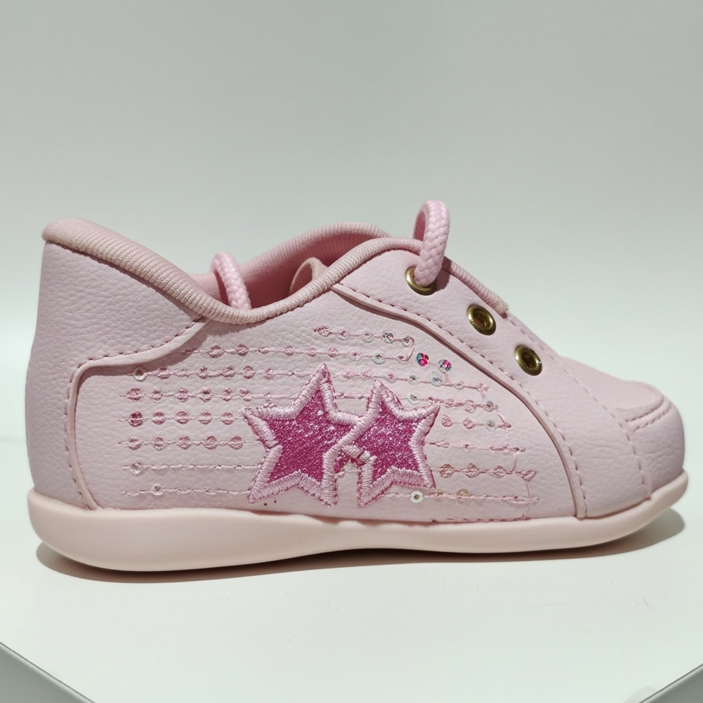 Este sapatinho é a combinação ideal de design lúdico e funcionalidade. Na cor rosa bebê, ele é confeccionado em material sintético macio e resistente, fácil de limpar. O grande destaque fica por conta da lateral, que apresenta um charmoso bordado de duas estrelas com glitter pink e um rastro de lantejoulas transparentes, adicionando um toque de glamour e magia a cada passo.