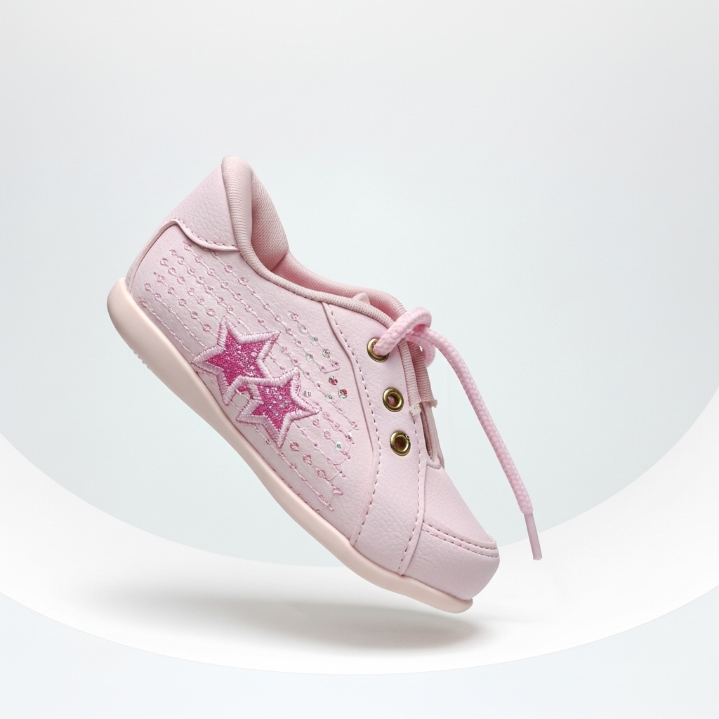Prepare-se para se apaixonar pelo novo Tênis Infantil de Estrelas, o calçado perfeito para os primeiros passos da sua menina com muito estilo, brilho e conforto!