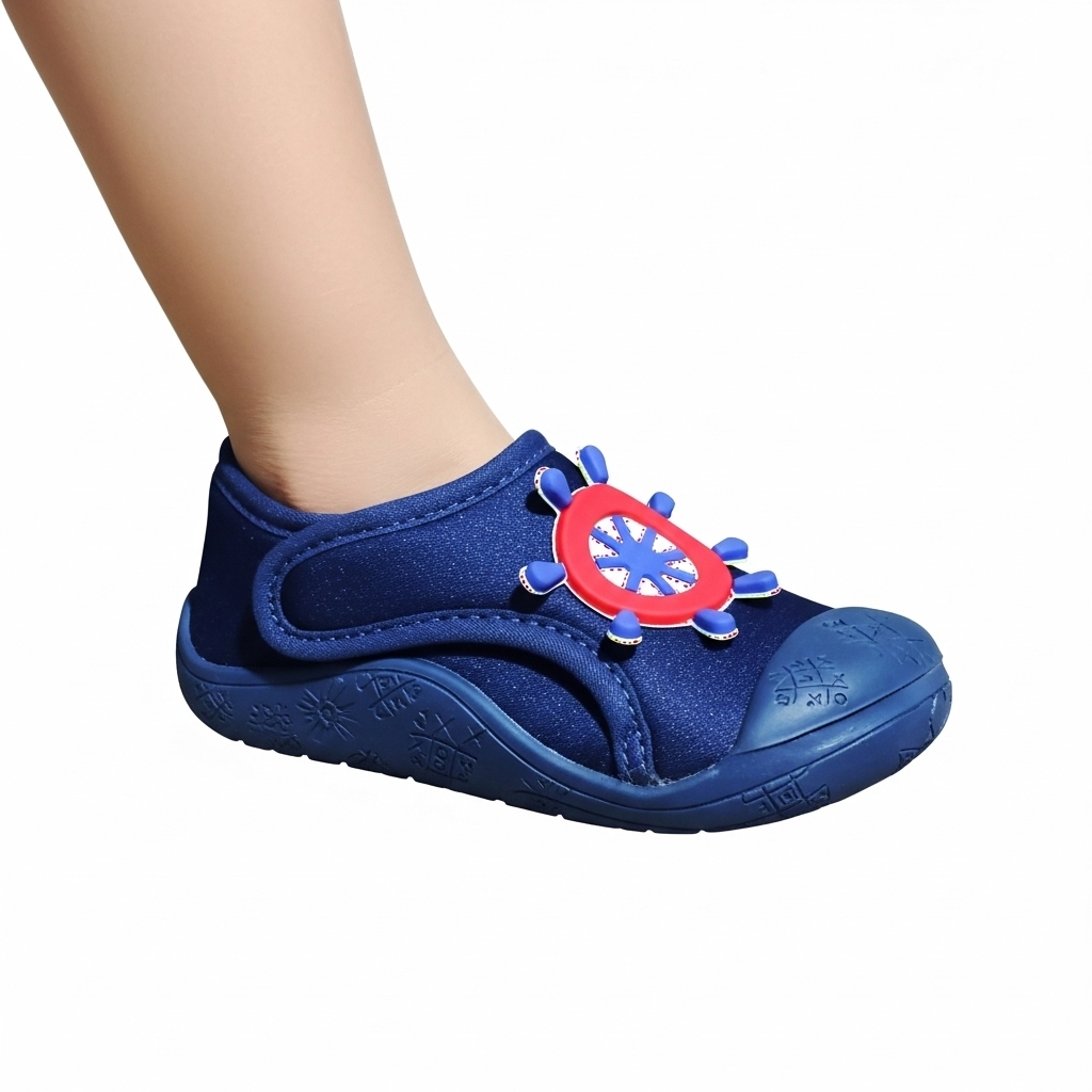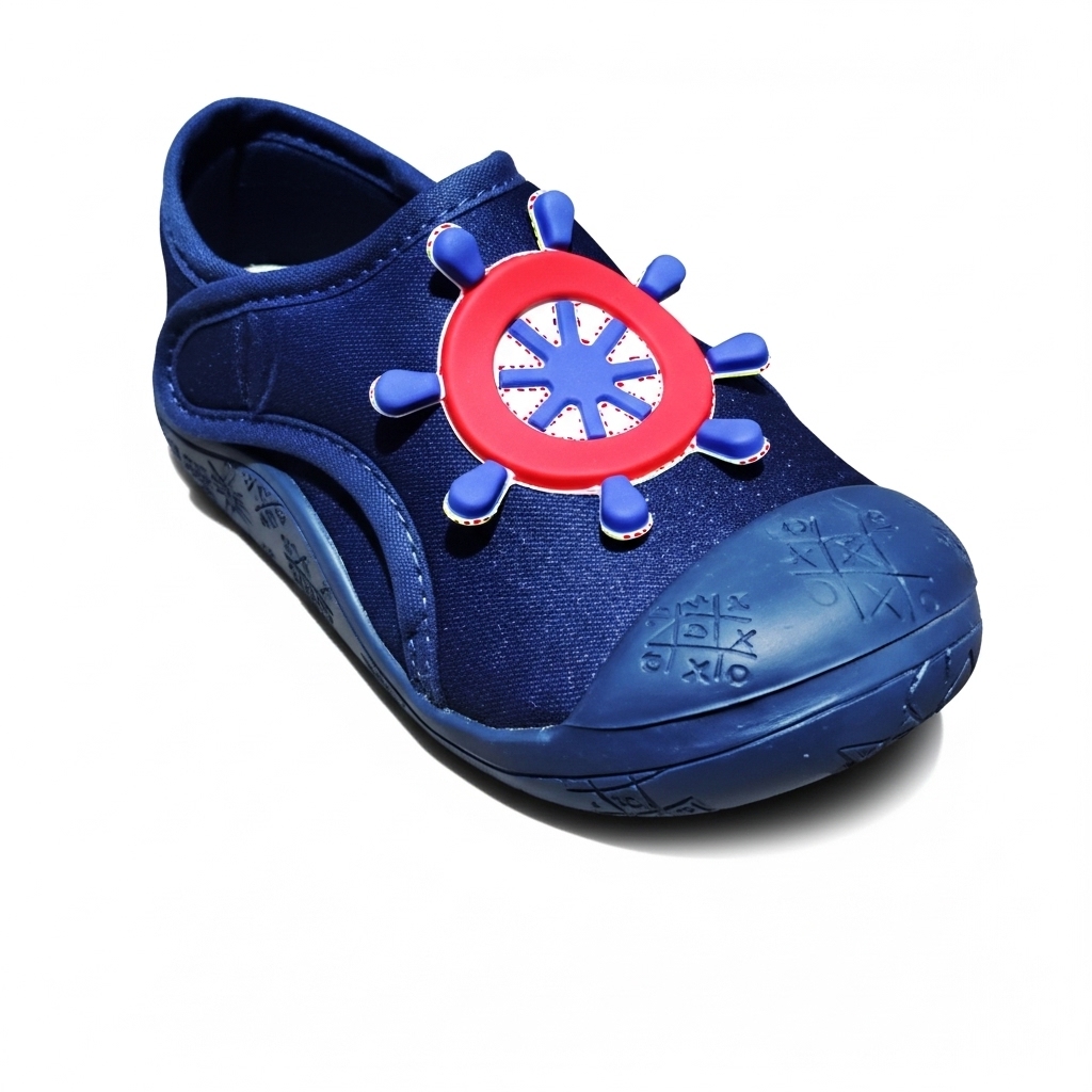 Elemento Temático: O peito do pé é adornado com um aplique 3D emborrachado de um timão de navio, nas cores vermelho, branco e azul royal, reforçando um divertido tema náutico.