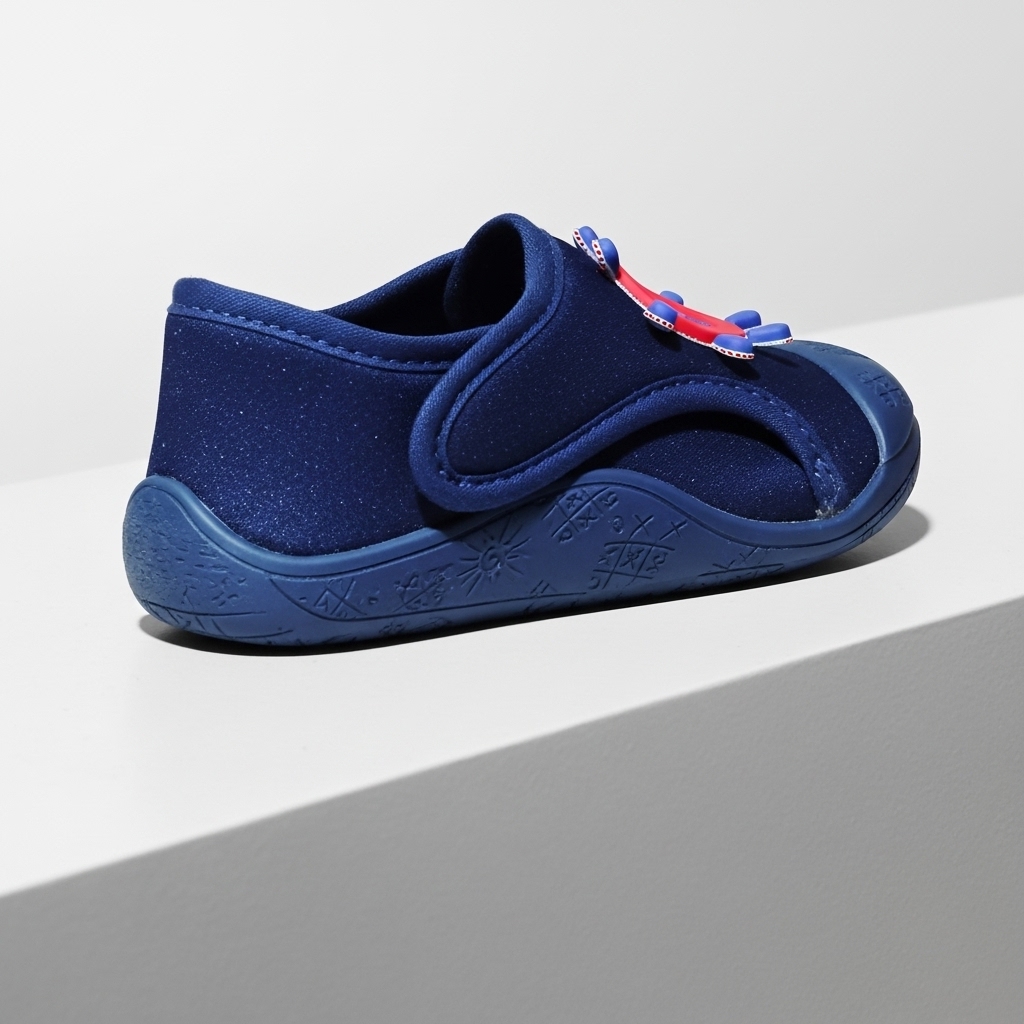 Design e Material (Cabedal): Confeccionado em material têxtil maleável e respirável na cor azul marinho, apresentando um acabamento levemente brilhoso (glitter) que adiciona um toque lúdico. O design é de “calce fácil” (easy-on), ideal para promover a autonomia da criança.