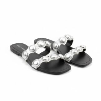 Sandália Rasteira Flat Metalizada com Aplicações de Maxi Esferas