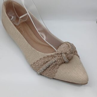 Sapatilha Bico Fino Bege com Nó em Crochê e Strass